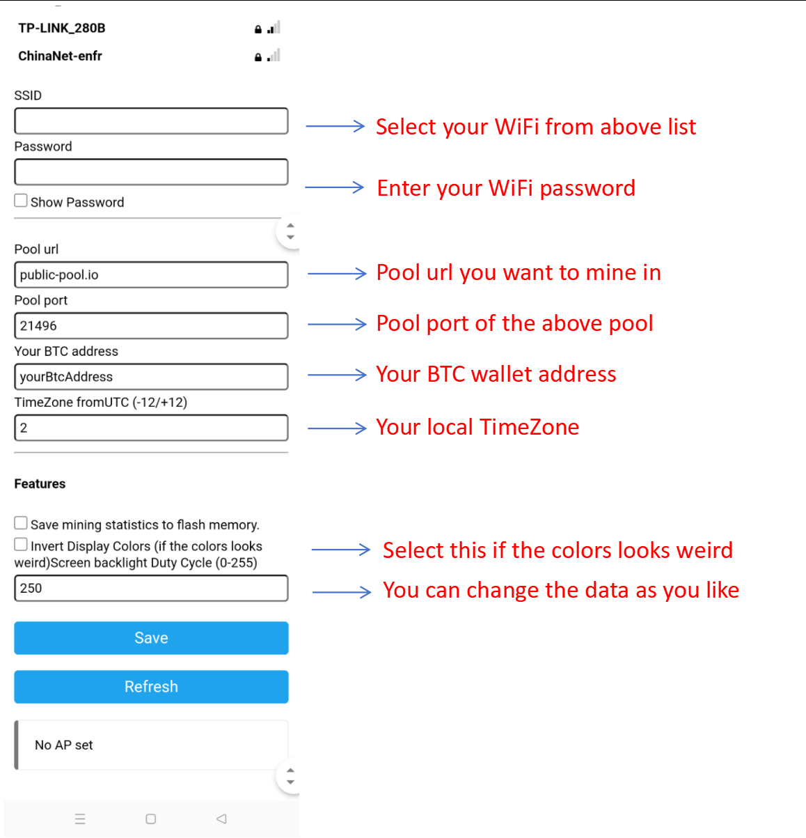 your Wi-Fi network, entering the Wi-Fi network password, and specifying the bitcoin address for receiving mined
